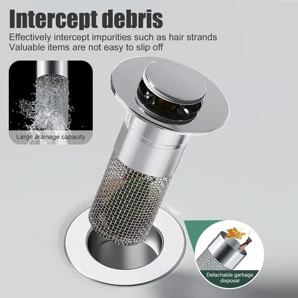 【VERBESSERTES 2-IN-1-DESIGN】Das Pop-up-Abflusssieb für Waschbecken verfügt über einen integrierten Korb, der Verstopfungen verhindert und Stöpsel sowie Sieb in einem vereint. Dieser Korb fängt Haare und andere Verunreinigungen auf und verhindert so, dass diese in den Abfluss gelangen. Dies gewährleistet einen effizienten Wasserabfluss und beugt Verstopfungen vor.