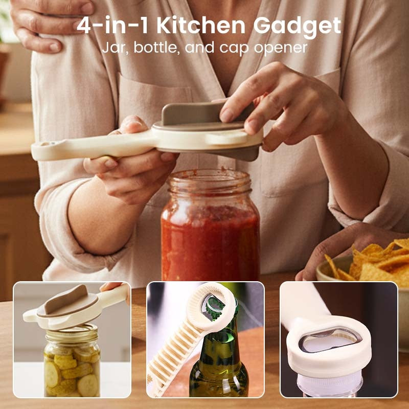 4-IN-1-MULTIFUNKTIONSWERKZEUG: Kombiniert vier wichtige Küchenwerkzeuge in einem kompakten Gerät, darunter einen Glasöffner, einen Flaschenöffner und zwei Schraubverschlussöffner, wodurch Sie wertvollen Platz in der Schublade sparen und Ihre Küchenarbeit vereinfachen.