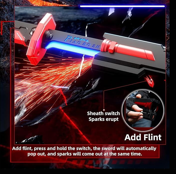 【Funken- und Blitzeffekt mit Feuerstein】: Legen Sie den Feuerstein in den Klingenhalter und halten Sie den Auslöseknopf gedrückt, um sichere, aber beeindruckende Funken und Blitze zu erzeugen. Perfekt, um epische Momente während Rollenspielen oder Cosplay-Auftritten zu schaffen.