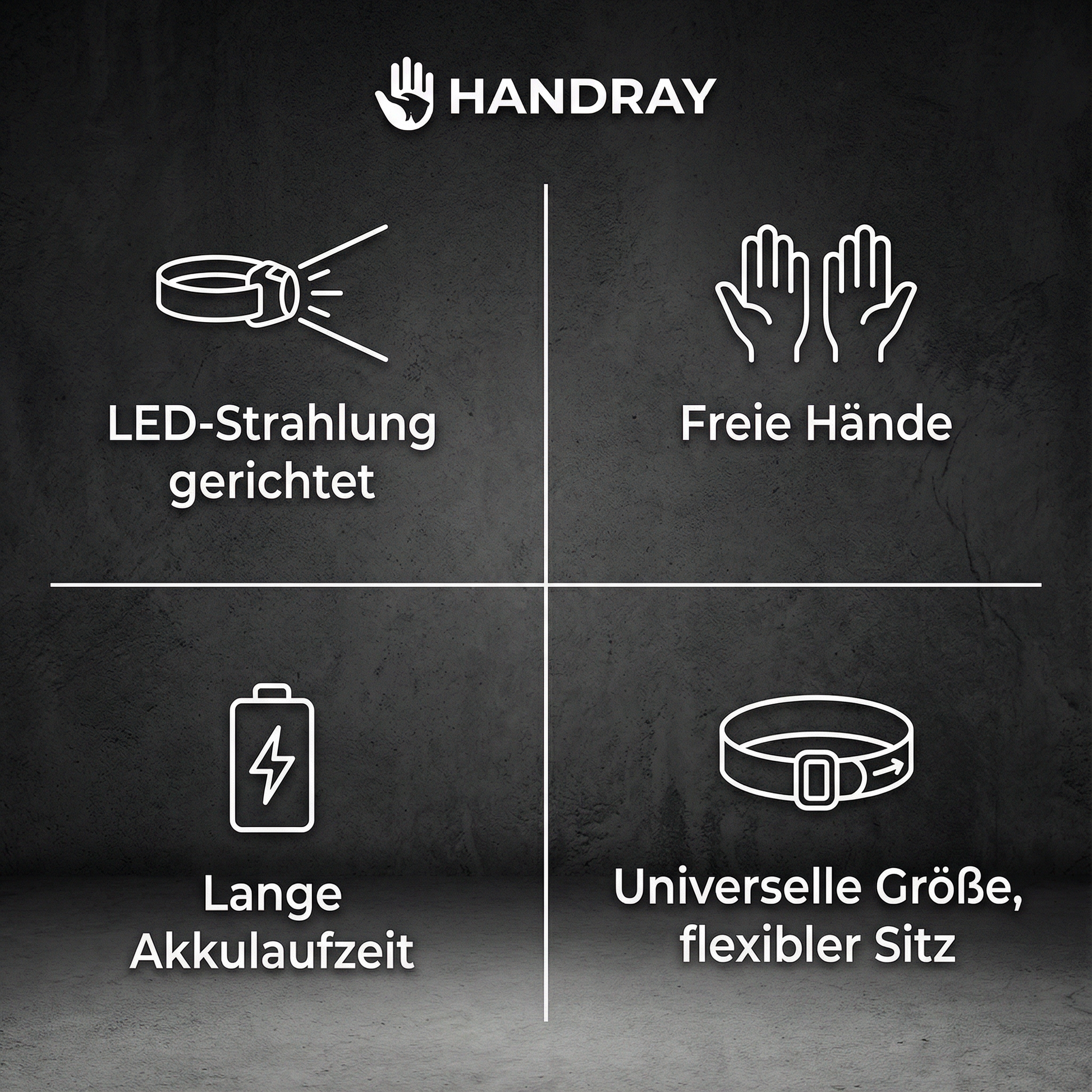 gezielte Ausleuchtung ohne Streulicht, beide Hände frei, lange Leuchtdauer durch energiesparende LEDs, weiches elastisches Material für hohen Tragekomfort, verstellbarer Klettverschluss für verschiedene Handgrößen, robust und langlebig für Werkstatt und Outdoor.