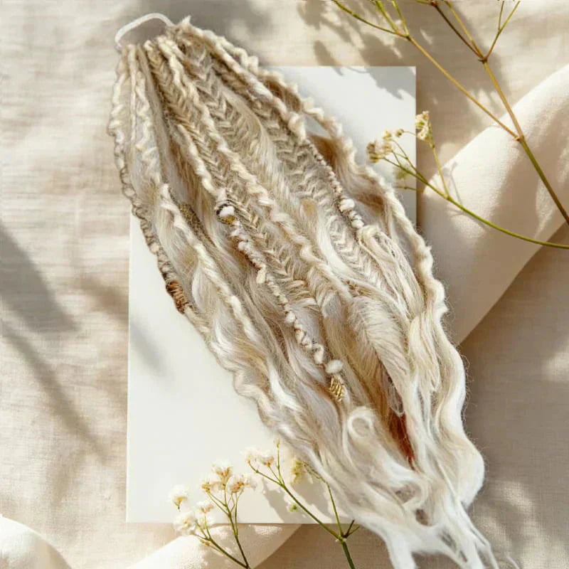 Instant Boho Pferdeschwanz – Das perfekte Accessoire, um deinem Haar mühelos einen lässigen Boho- oder Beach-Look zu verleihen. In nur einer Minute verwandelst du deinen Look mit zusätzlichen Strukturen aus Dreadlocks, Perlen und natürlichen Elementen – egal, ob du einen entspannten, freien Stil oder etwas Abenteuerlicheres bevorzugst.