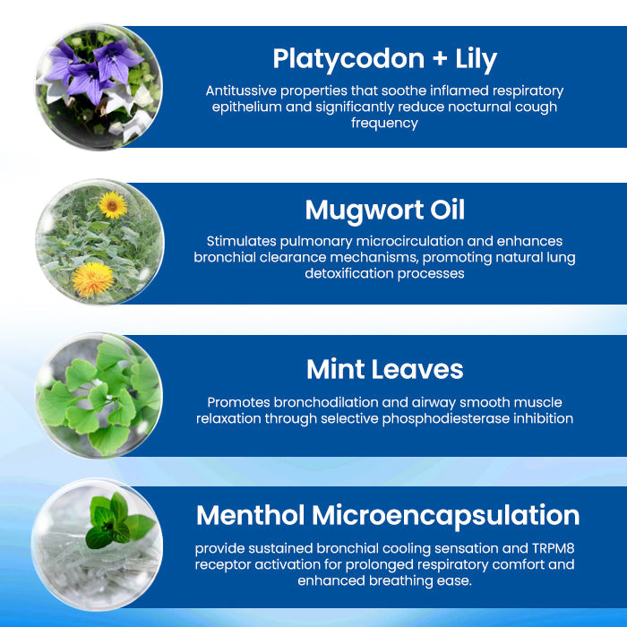🌿Eucalyptus Oil: Provides a powerful cooling effect, helps clear lung mucus and phlegm, relieves breathing difficulties, and promotes airflow.