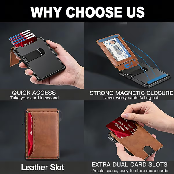 Der robuste Geldclip auf der Rückseite sorgt dafür, dass Ihr Bargeld ordentlich verstaut und leicht zugänglich ist. So können Sie Geldscheine mitnehmen, ohne dass Ihre Tasche unnötig aufträgt, und behalten gleichzeitig ein schlankes und stilvolles Erscheinungsbild für den täglichen Gebrauch.